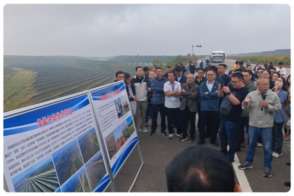 在实地考察环节,参会代表一行前往海州矿排土场农光互补项目现场及海州露天矿综合治理区域。代表们详细了解了项目的规划设计、建设运营及生态效益等情况。据现场介绍,海州露天矿通过 “光伏 + 生态修复” 模式,在废弃矿坑区域布局光伏项目,不仅实现了清洁能源生产,还通过光伏板遮挡、土壤改良等措施,有效改善了区域生态环境,明显提升了矿山复绿效果,形成了 “板上发电、板下复绿” 的双赢格局,为全国同类矿山生态修复提供了可借鉴的实践样本。